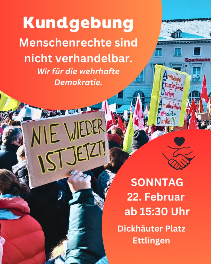 Am Sonntag, den 22. Februar 2026, lädt ein breites Bündnis aus zivilgesellschaftlichen Organisationen, Kirchen, Verbänden, Parteien und Initiativen aus Ettlingen und der Region unter dem Motto „Menschenrechte sind nicht verhandelbar. Wir für die wehrhafte Demokratie“ zu einer Kundgebung für Menschenrechte und gesellschaftlichen Zusammenhalt ein. Die Veranstaltung beginnt um 15:30 Uhr auf dem Dickhäuterplatz in Ettlingen. Die Kundgebung startet um 16 Uhr. Bei der Kundgebung sind Redebeiträge aus Zivilgesellschaft, Kirche und Initiativen geplant.